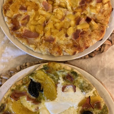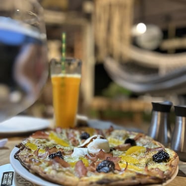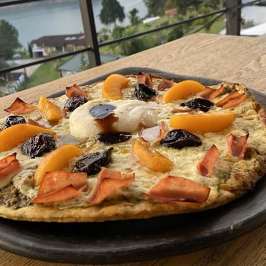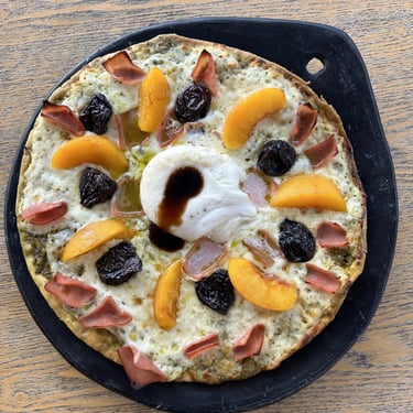 Base de Pesto y queso mozzarella premium, con trozos de jamón, duraznos, ciruelas y burrata de búfala.