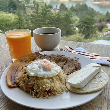 Frijoles con arroz. Acompañados de carne (res, cerdo o pollo), huevos, tajada de plátano maduro, quesito, arepa y bebida caliente (chocolate con o sin leche / café con o sin leche)